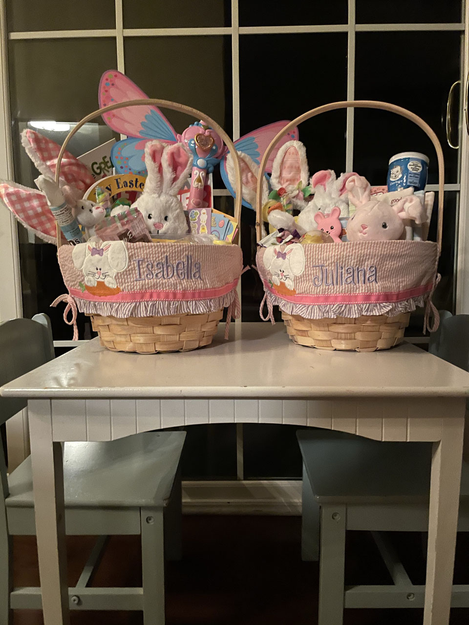 Now that we have kids, Easter is so much more exciting. My girls absolutely love decorating the house, dying Easter eggs, dressing up in their Easter dresses and hats, and of course, hunting for Easter eggs. As for the Easter bunny, they have really cute personalized baskets that we put out the night before, and the bunny comes and fills it with treats! They get the usual chocolate eggs and candy, and he likes to throw in some fun surprises like sidewalk chalk, bubbles, coloring books, crayons, and stickers. He must also know we take our annual spring break trip right after Easter because he’s been known to throw in some sunglasses and swimsuits, too.
