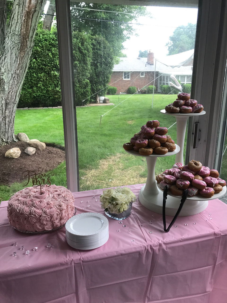 When hosting a shower at home, you are responsible for every little detail. I decided to start with the menu. We decided on having a Sunday brunch catered and providing mimosas and a coffee bar. We almost decided to make the food ourselves (egg bakes, french toast casseroles, etc…) but I am thankful we were able to do the catering because it was a lot of work even without cooking the food. I’m sure it can be done, but I was happy with the route we chose (Thanks, Mom!). For our menu, we had scrambled eggs, sausage, bacon, breakfast potatoes, and fruit. We also had a cute mini donut tower which was one of my favorite parts. My dear talented friend provided our gorgeous cake*** ***and my mom and sister and I baked cookies for favors with another dear talented friend of my mom.
