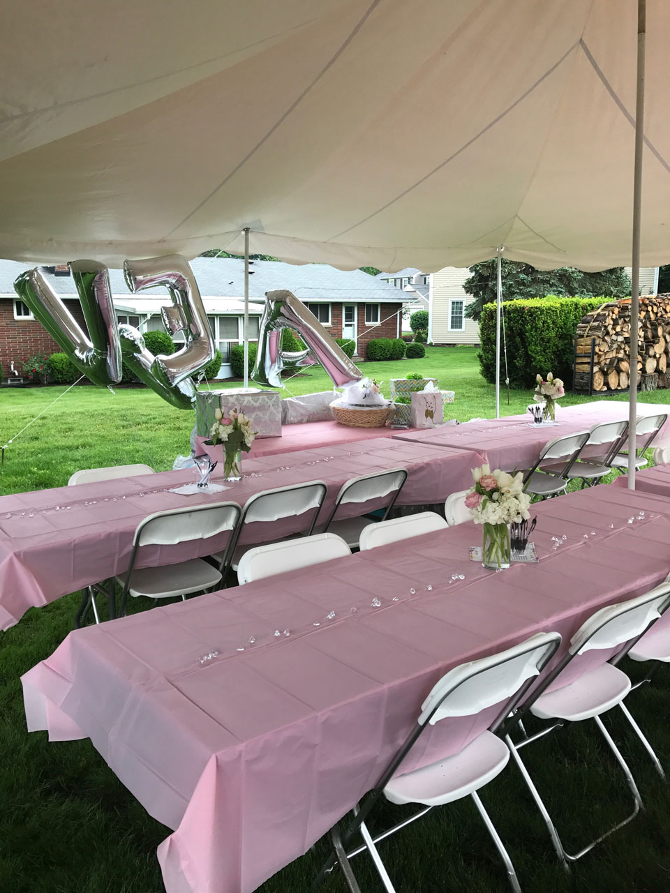 The next step was the aesthetic, which meant somehow turning my backyard into a formal event. We rented a white tent and tables with white chairs. We then purchased pink tablecloths and pretty plates, napkins, cups and plasticware for the party. Remember when having the party that you will also need*** trash cans*** set up nearby and hopefully some helpful bridesmaids who will be happy to be table bussers for your other guests when they finish eating ;)