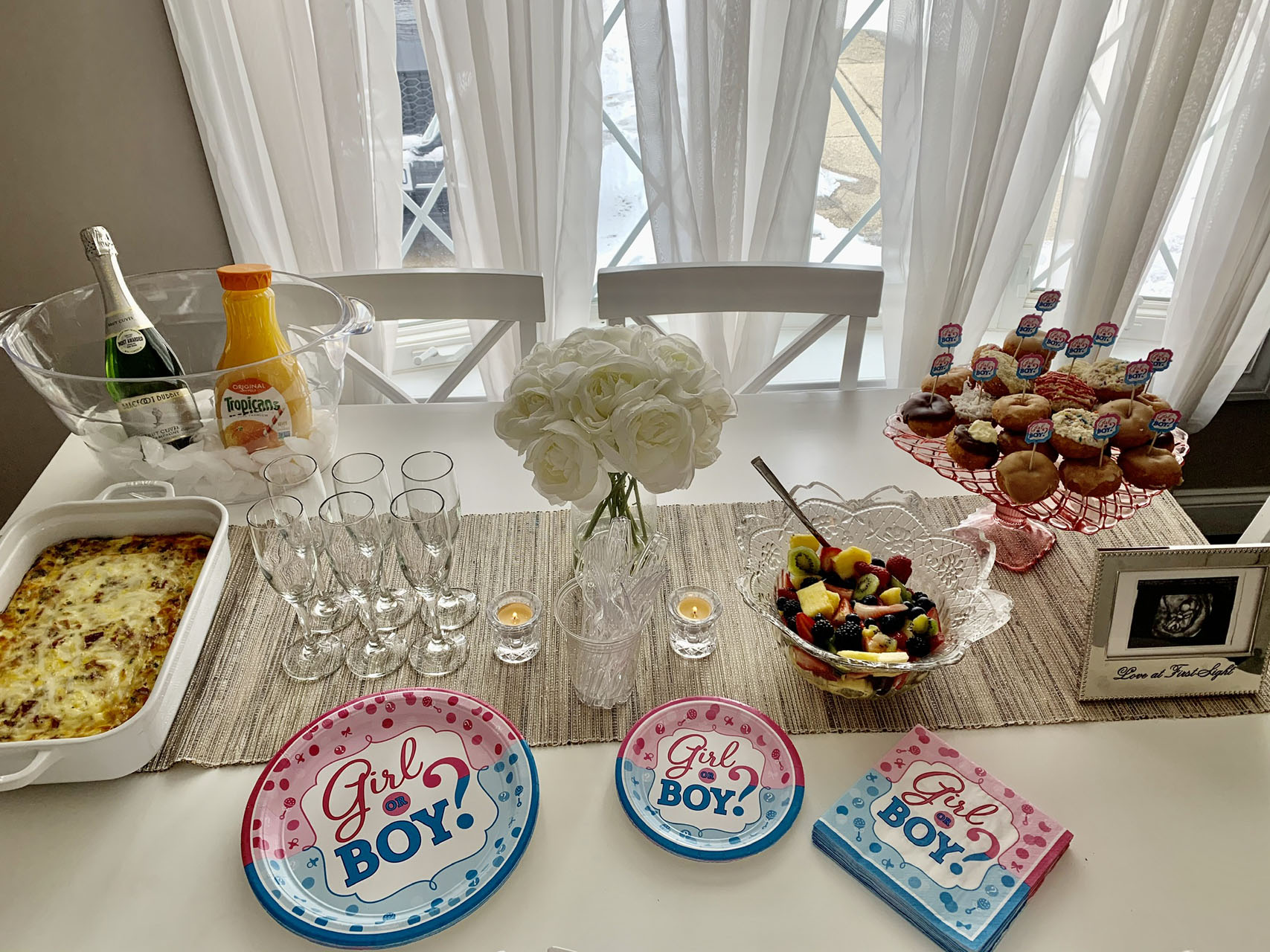 I considered having a “sprinkle” for our second baby instead of a shower, but since we didn’t do a gender reveal the first time around, this felt like the perfect way to celebrate our new baby. I just wanted to have something small and intimate with our family at our home (I think I was already nesting). Always the party planner, I came up with a simple brunch menu (brunch is a major hobby of mine, as you may notice throughout my blogs). I made a breakfast casserole with hashbrowns, fruit salad, and mini donuts along with mimosas (just OJ for me, in a champagne glass, of course). We had cute “boy or girl” plates, napkins, and toothpicks in the donuts. We even had a framed sonogram picture on the table which made it feel even more special.