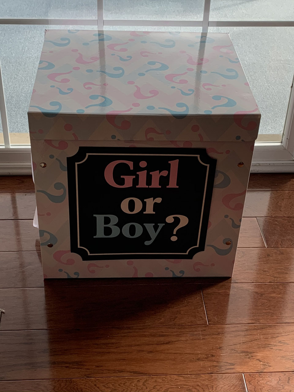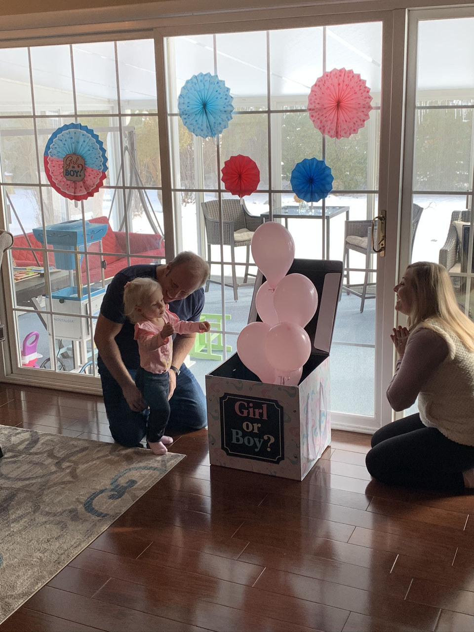 For the reveal, we purchased a cute box that matched the plates and napkins and my friend was in charge of adding the balloons that would be either blue or pink. I am a TERRIBLE secret keeper, so I was so proud of myself that I did not peek or have any information whatsoever of what the result would be. My husband and I were both pretty convinced we were having a boy, so when the box opened and saw PINK balloons come out, our reactions were pretty priceless!