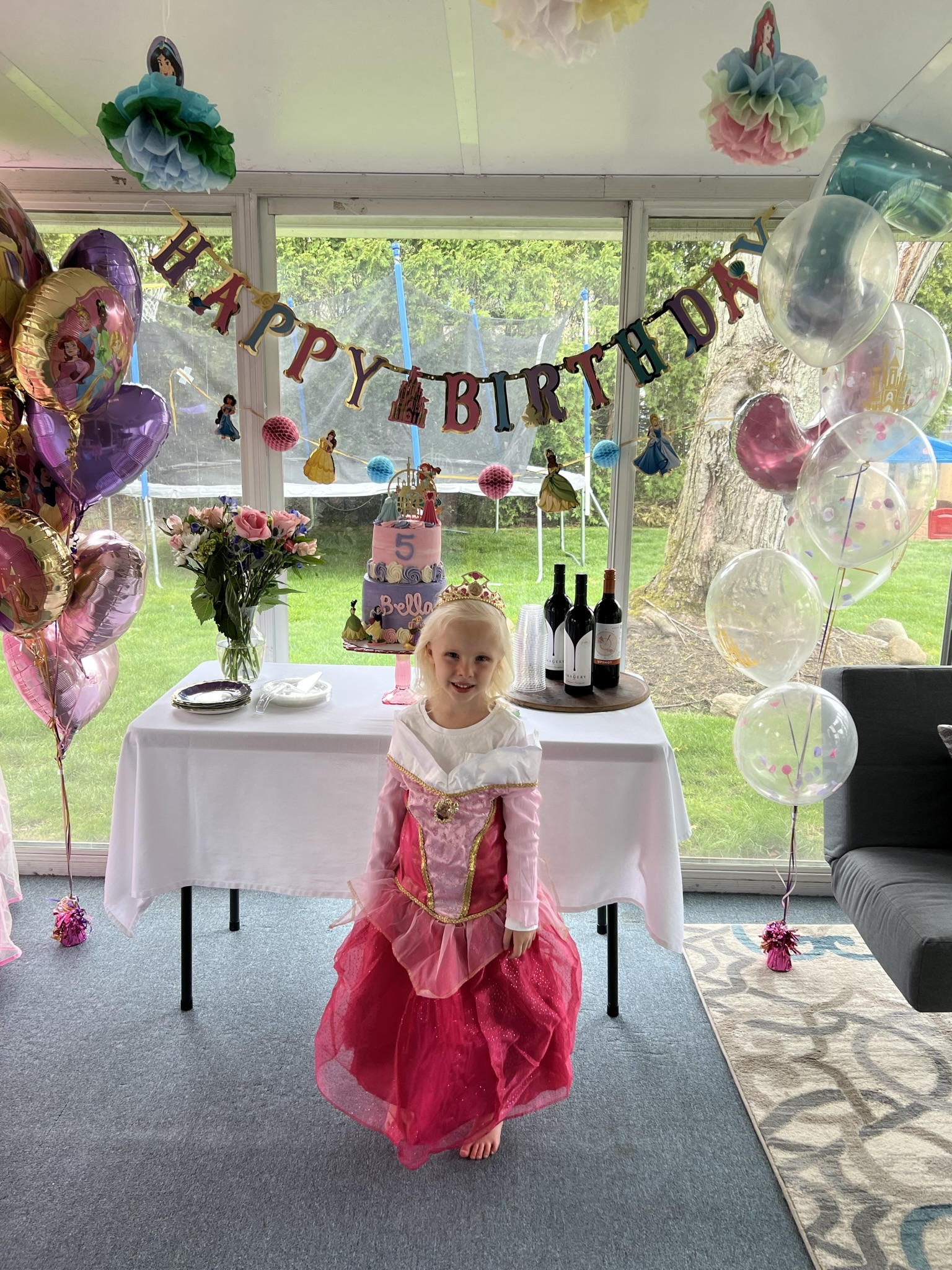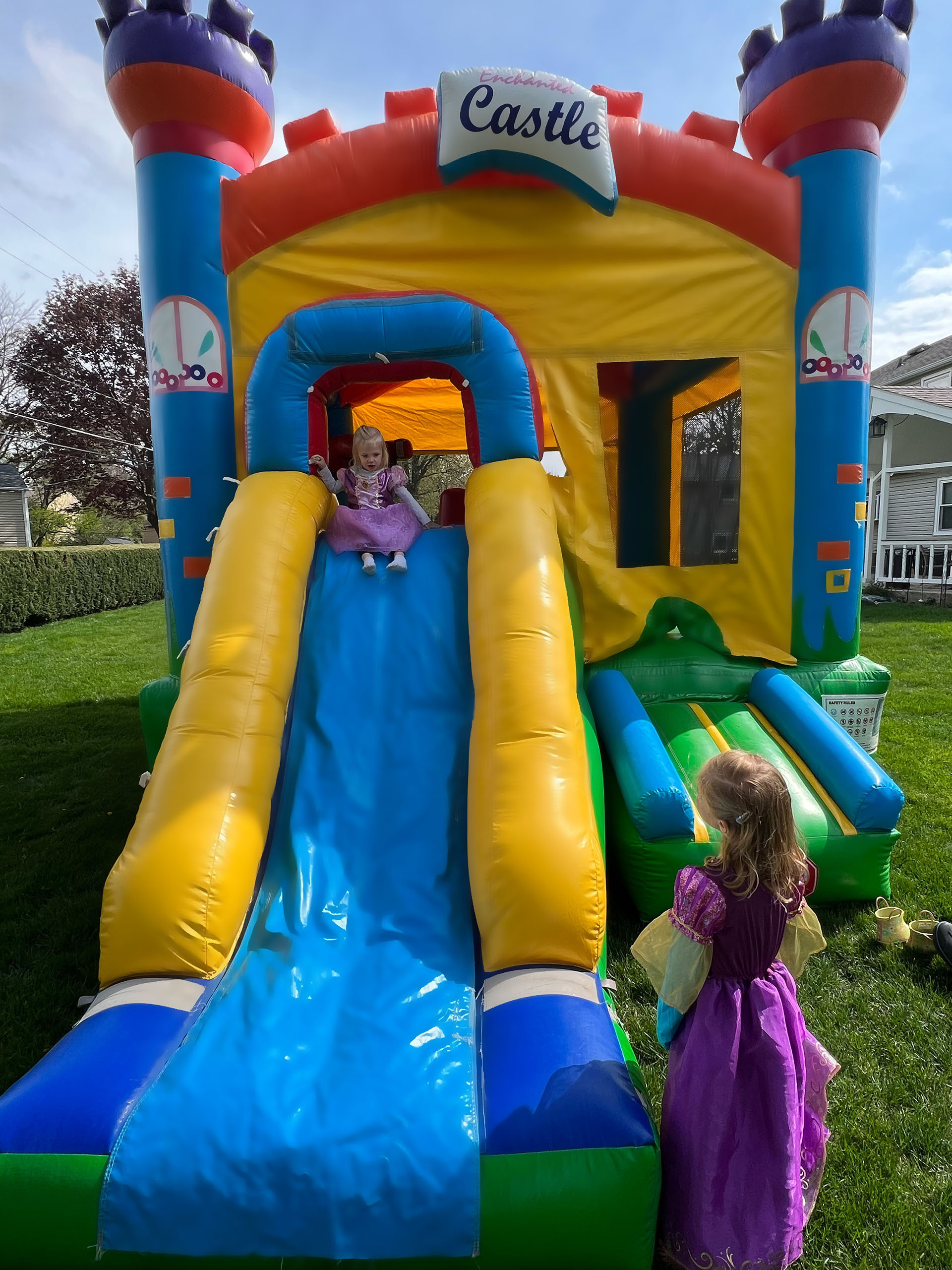 As for preparation, I like to set everything up long before the food arrives so if anything takes longer than I expect I don’t go crazy. (For example, the hanging 3-D princesses took a while to poof up, I did those, hung the banners, and laid out the tablecloths to unwrinkle the night before.). The day of the party is reserved for last minute decorations, making appetizers, setting up drinks, making sure the house/outside are clean and ready to go, and that myself and my husband and kids are presentable. One thing I failed to do this year was take a family photo before the party started. My girls had already fully been jumping in the bouncy castle and their hair was crazy in the picture. But everyone had a magical time, and that is what matters. I feel optimistic about being booked for future events, so be sure to subscribe for more party planning tips and tricks!